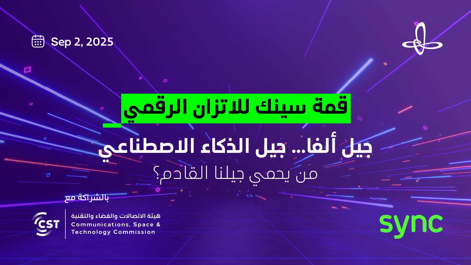 تستضيف هيئة الاتصالات والفضاء والتقنية قمة سينك للاتزان الرقمي، تحت شعار "جيل ألفا، جيل الذكاء الاصطناعي: من يحمي الجيل القادم؟"، وتجمع قادة الفكر والمؤثرين العالميين؛ وتقدم رؤى طموحة، وتجارب واقعية، وبيانات دقيقة؛ لإعادة تصور سُبل حماية جيل المستقبل، وجيل الذكاء الاصطناعي، وتعميق النقاش حول قضايا الاتزان الرقمي.