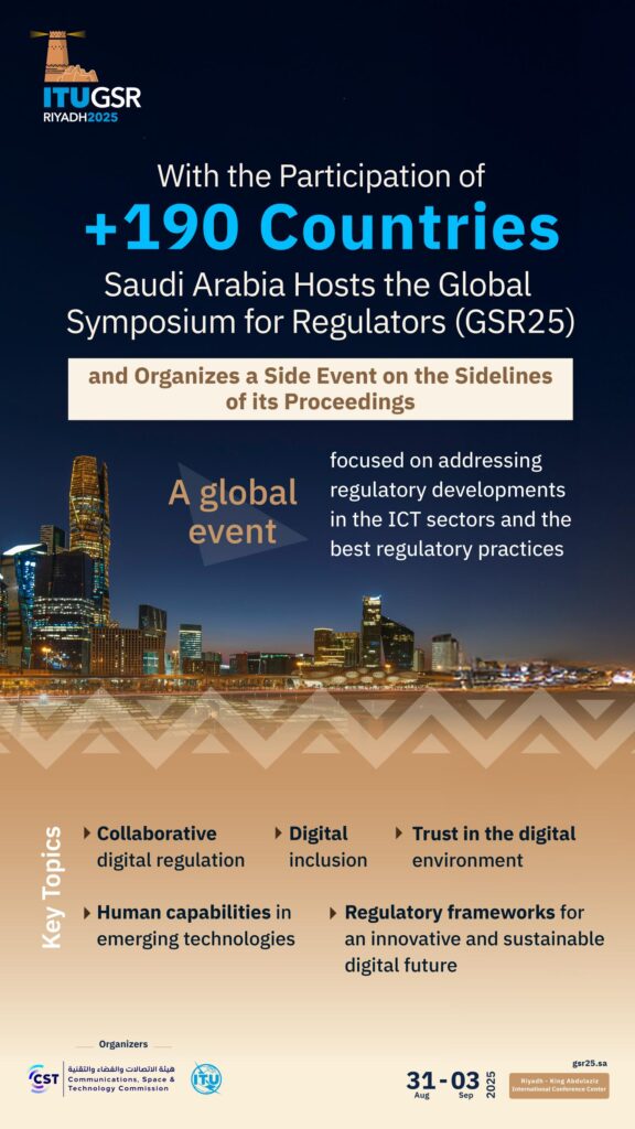 Saudi Arabia, represented by the Communications, Space & Technology Commission (CST), is hosting the Global Symposium for Regulators (GSR25) with the participation of more than 190 countries, in partnership with the International Telecommunication Union (ITU), under the title: “Regulation for Sustainable Digital Development”. The symposium will take place at the King Abdulaziz International Conference Center in Riyadh from August 31 to September 3, 2025.